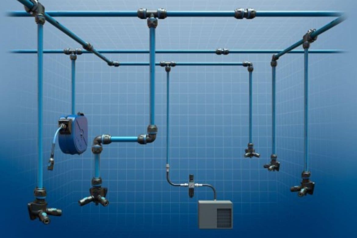 Todo el equipo que se necesita para distribuir aire comprimido a tus equipos de trabajo está aquí, tubería, herramientas, enrolladores, prolongadores de fácil instalación.